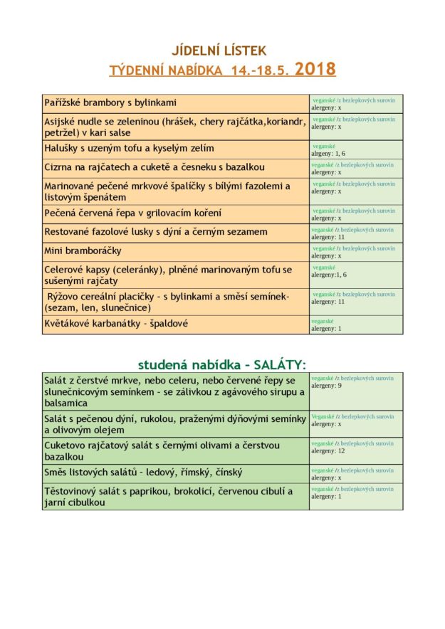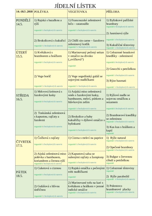 JÍDELNÍ LÍSTEK NA TÝDEN od 14. od 18.5.2018