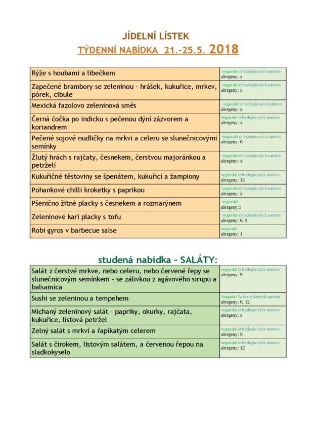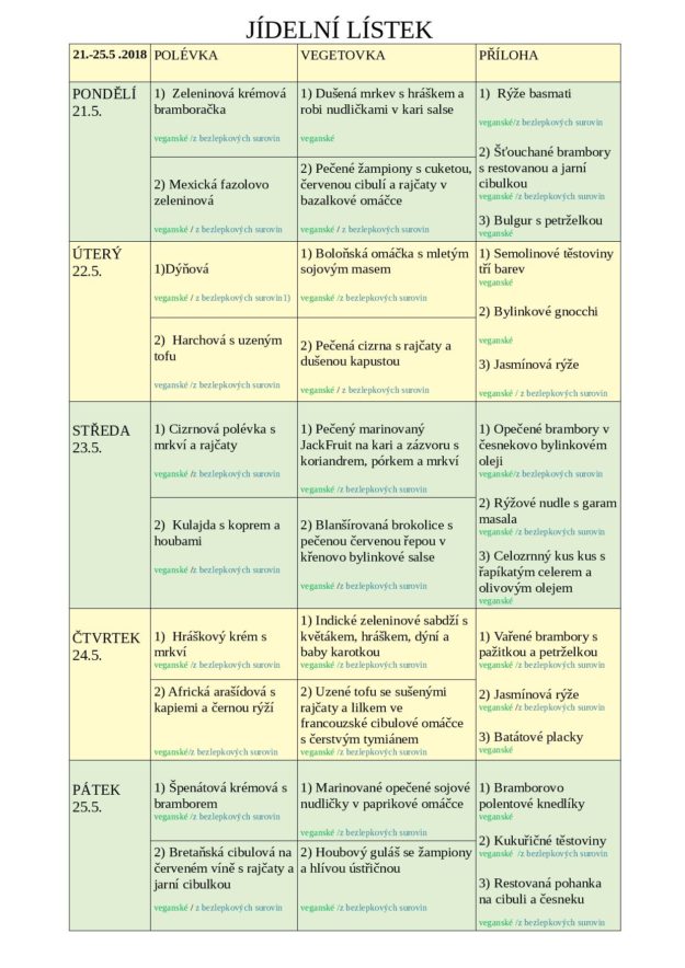 JÍDELNÍ LÍSTEK NA TÝDEN od 21. do 25.5.2018