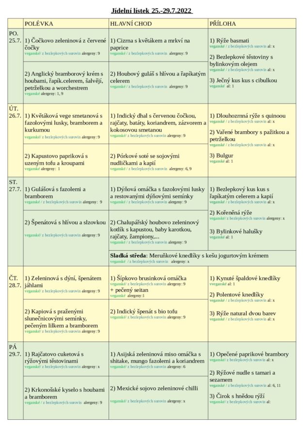 JÍDELNÍ LÍSTEK 25.-29.7. 2022