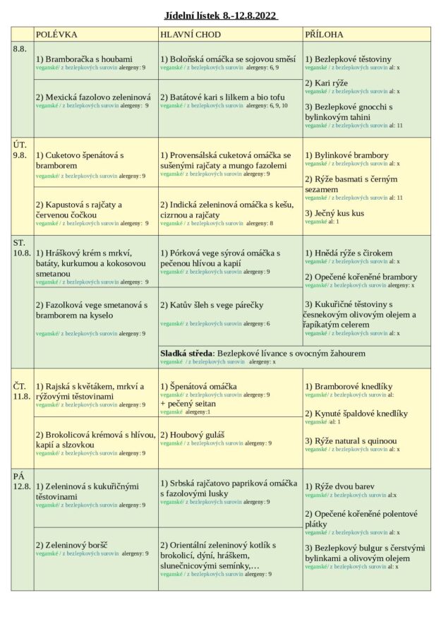 JÍDELNÍ LÍSTEK 8.-12.8. 2022