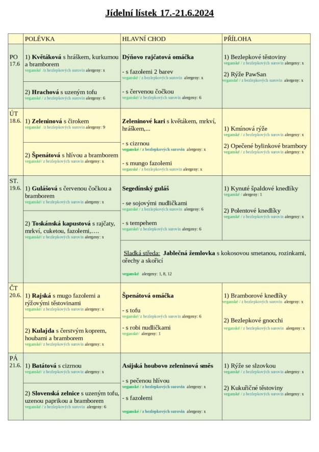 JÍDELNÍ LÍSTEK 17.-21.6. 2024