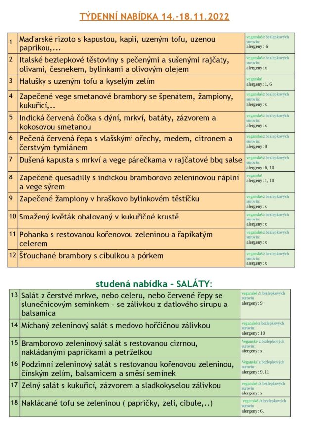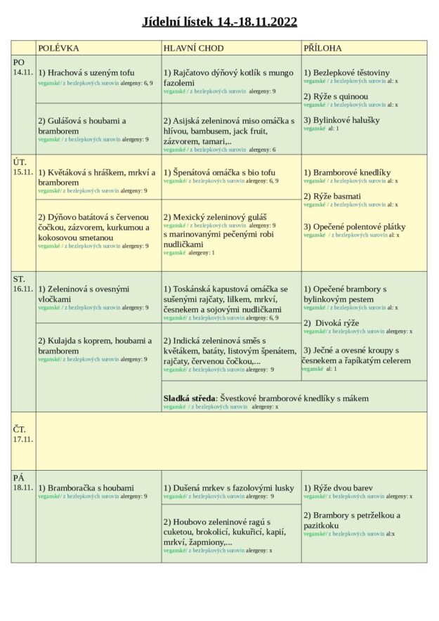 JÍDELNÍ LÍSTEK 14.-18.11. 2022