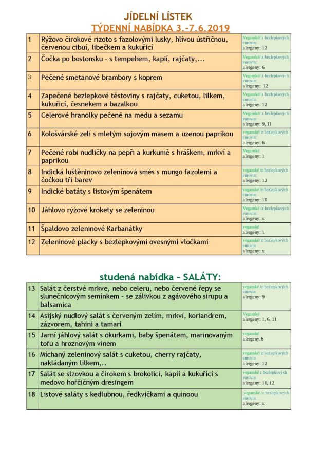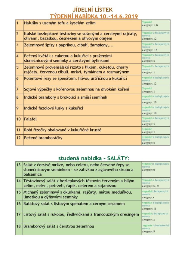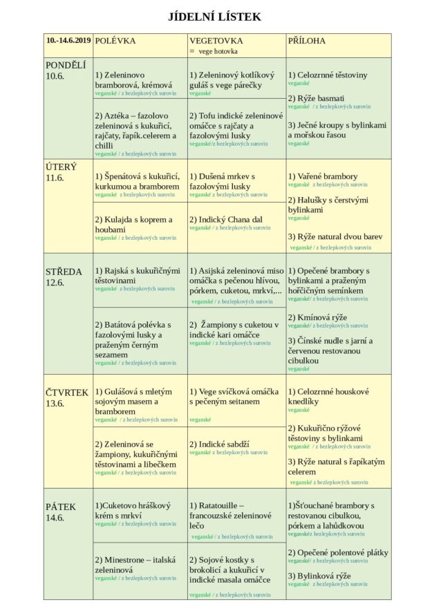 JÍDELNÍ LÍSTEK NA TÝDEN od 10. do 14.6.2019