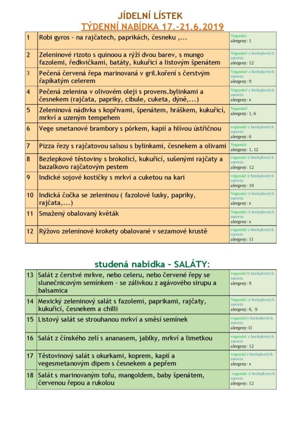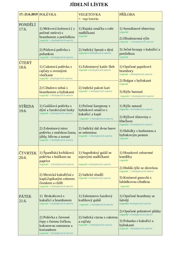 JÍDELNÍ LÍSTEK NA TÝDEN od 17. do 21.6.2019