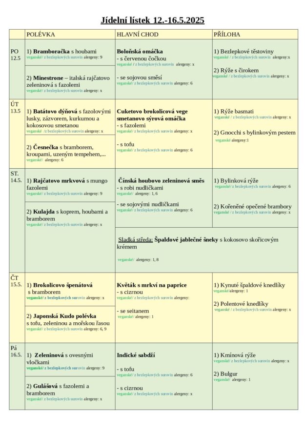 JÍDELNÍ LÍSTEK 12.-16.5. 2025