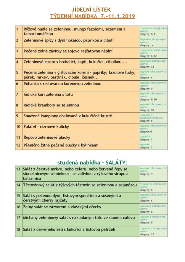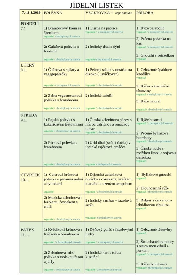 JÍDELNÍ LÍSTEK NA TÝDEN od 7. do 11.1.2019