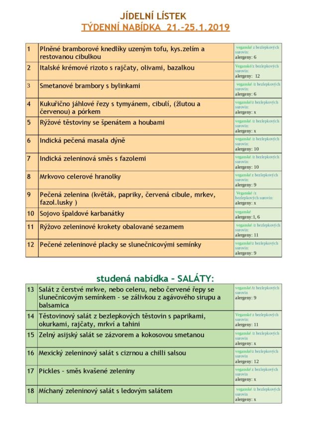 JÍDELNÍ LÍSTEK na týden od 21. do 25.1.2019