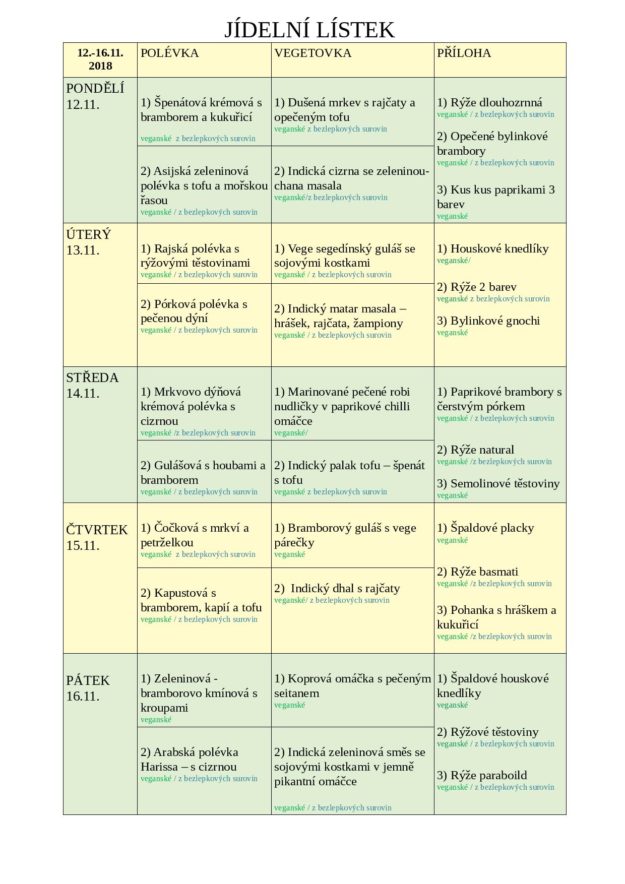 JÍDELNÍ LÍSTEK NA TÝDEN od 12. do 16.11.2018