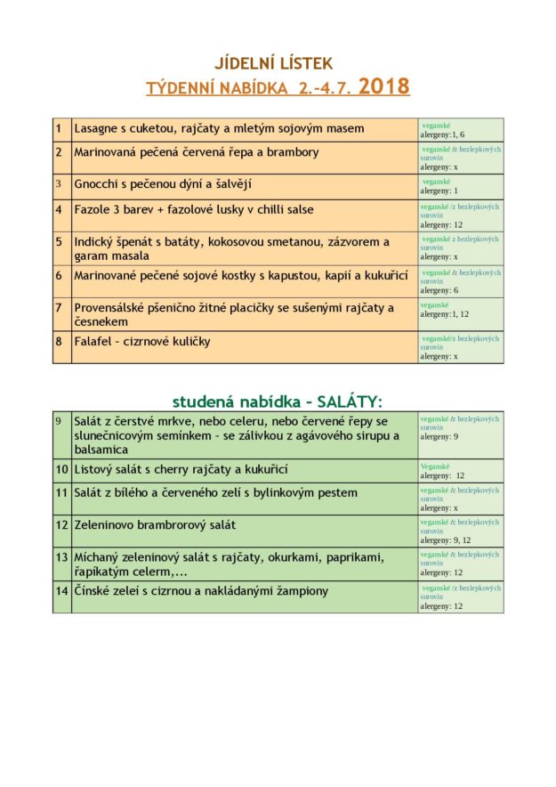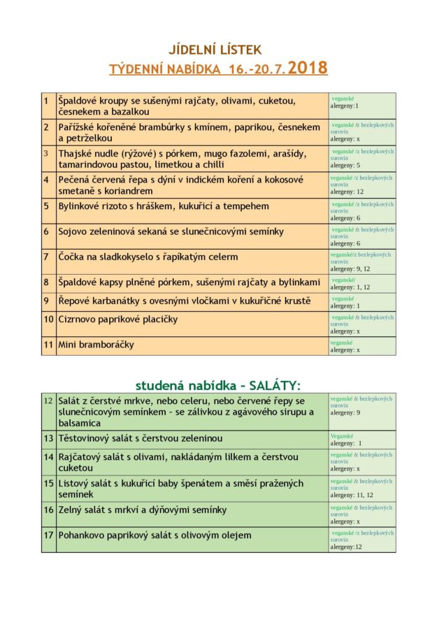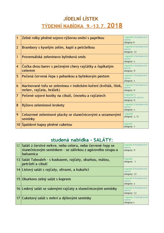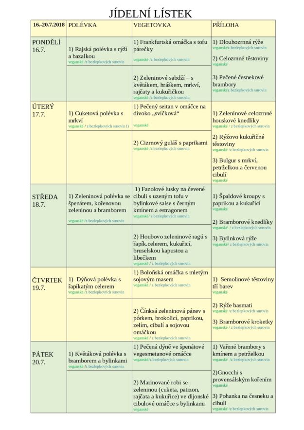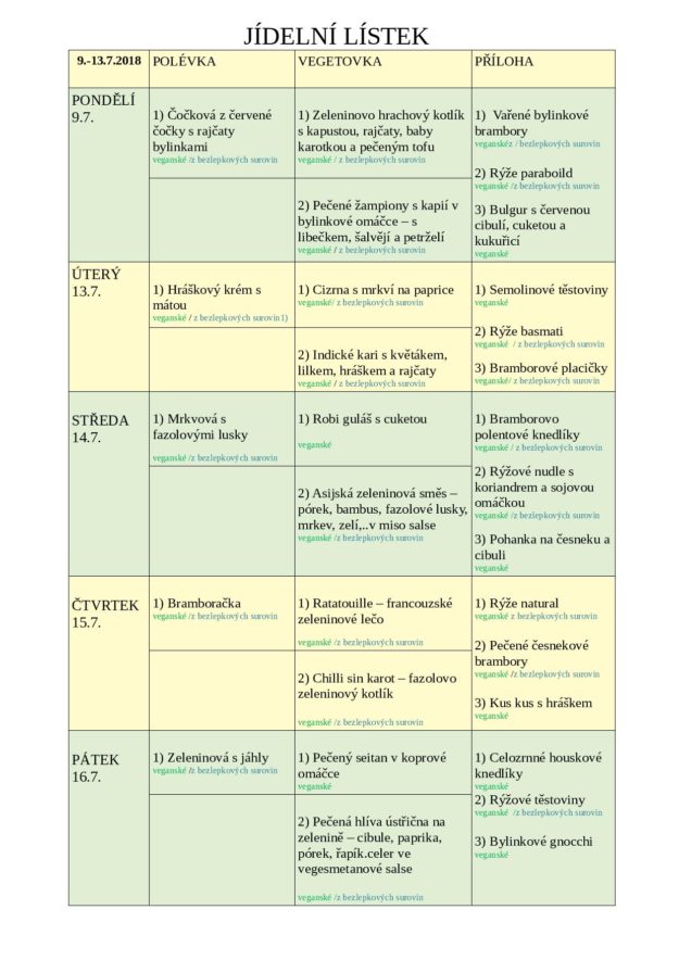 JÍDELNÍ LÍSTEK 9.-13.7.2018