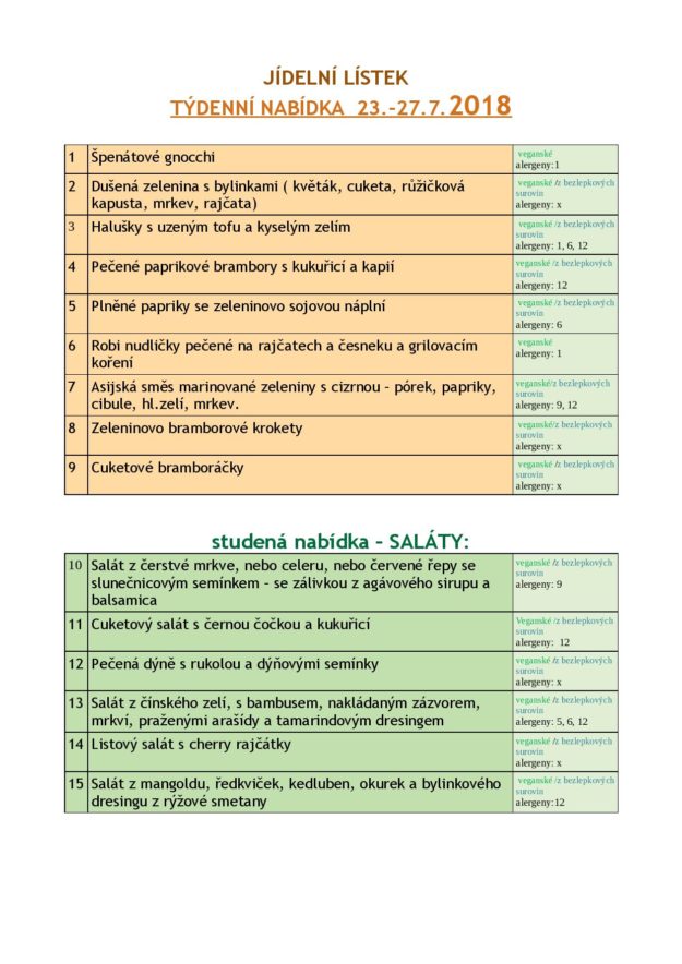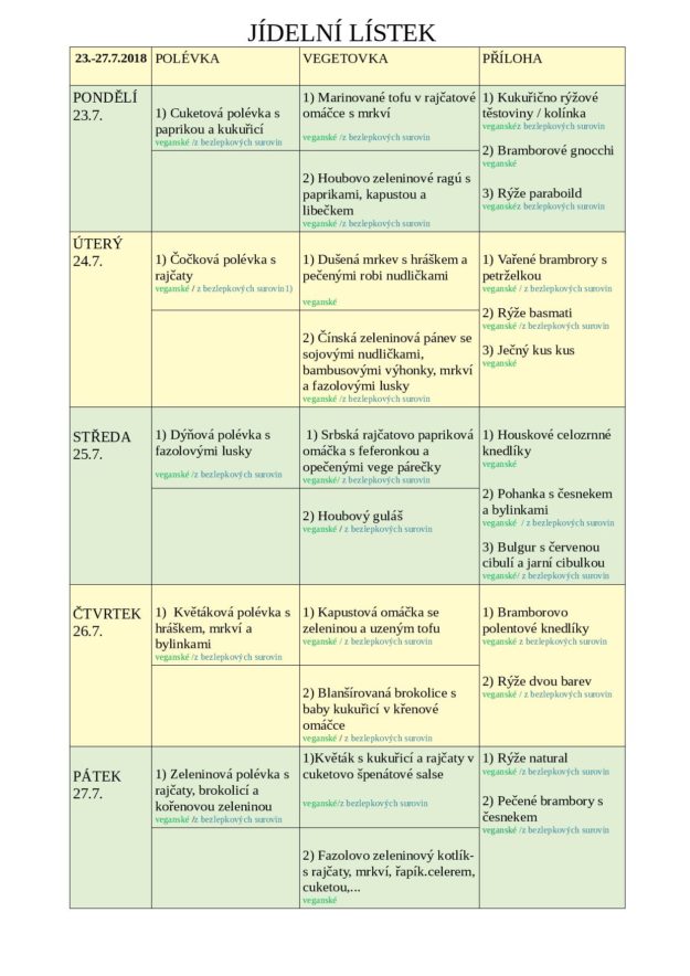 JÍDELNÍ LÍSTEK NA TÝDEN od 23. do 27.7.2018