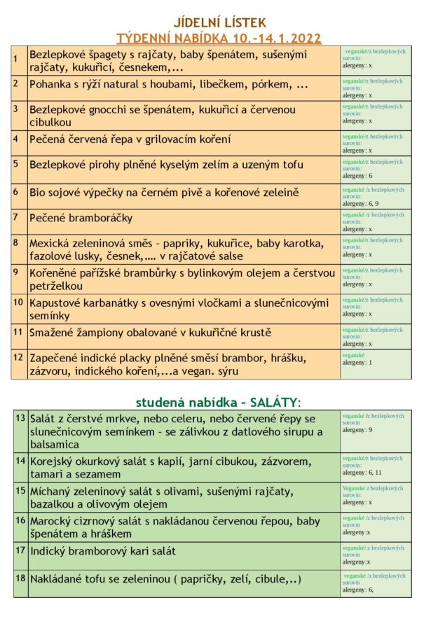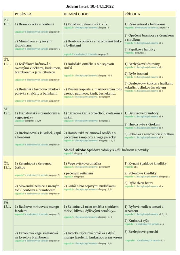 JÍDELNÍ LÍSTEK 10.-14.1.2022