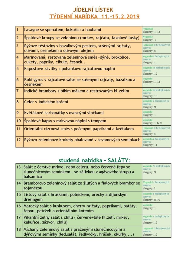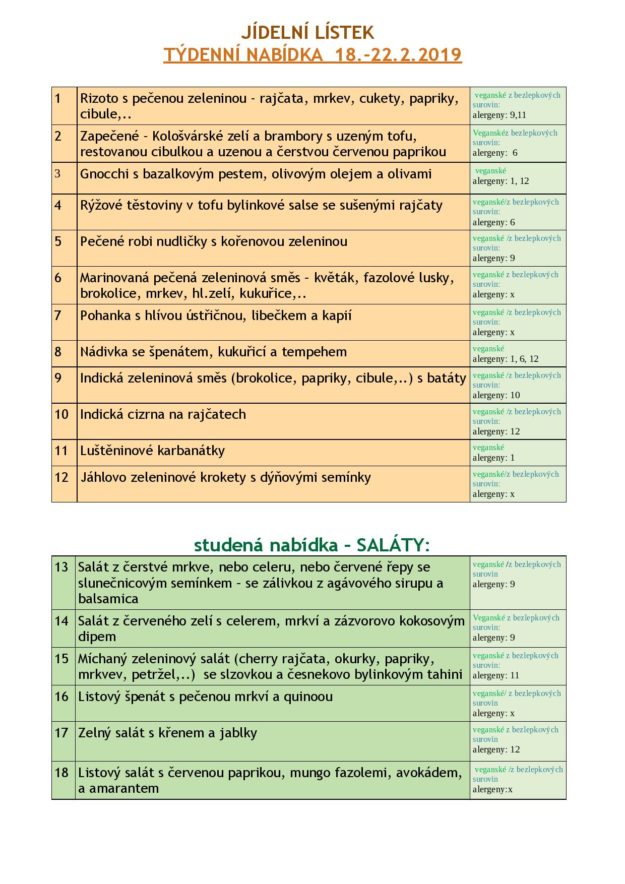 JÍDELNÍ LÍSTEK NA TÝDEN od 18. do 22.2.2019