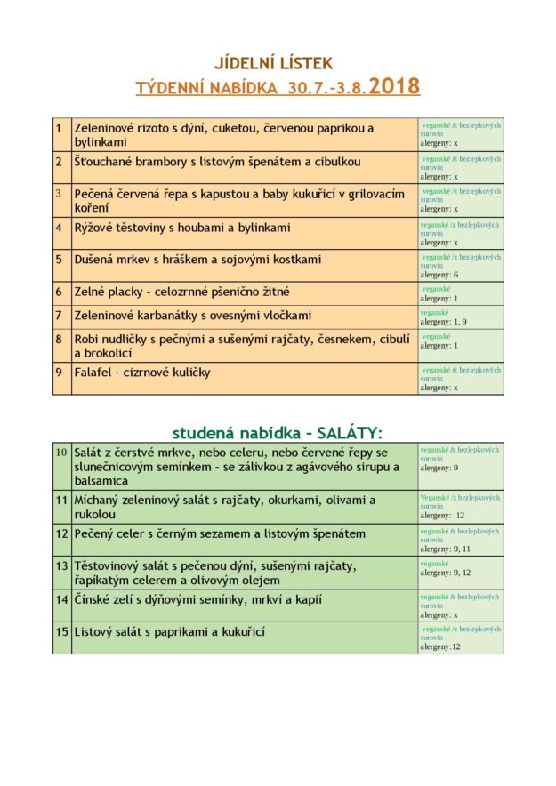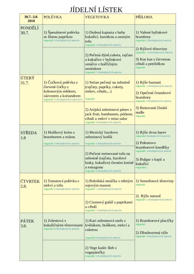JÍDELNÍ LÍSTEK NA TÝDEN od 30.7. do 3.8.2018