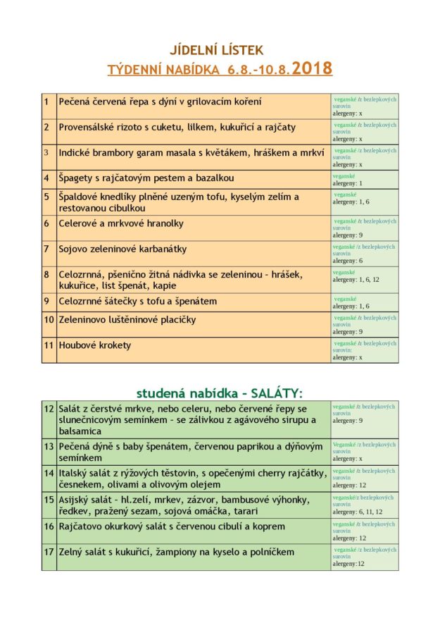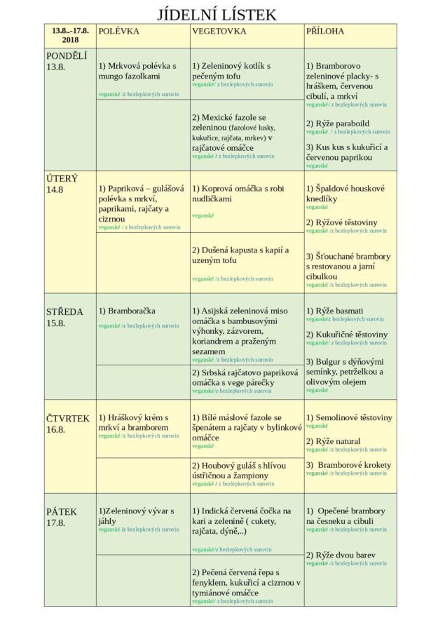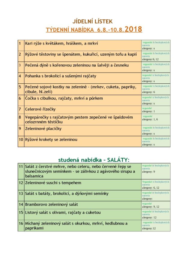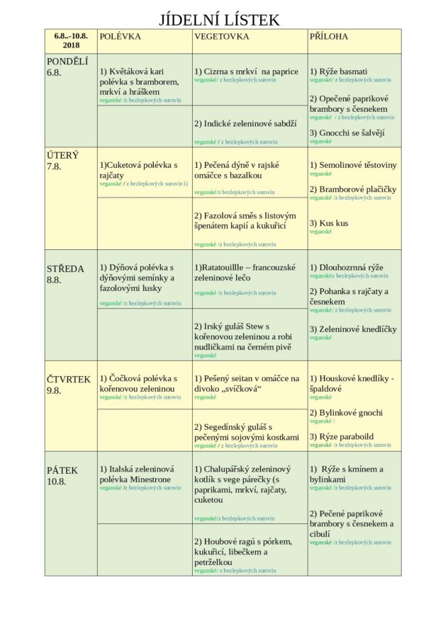 JÍDELNÍ LÍSTEK NA TÝDEN od 6. do 10.8.2018