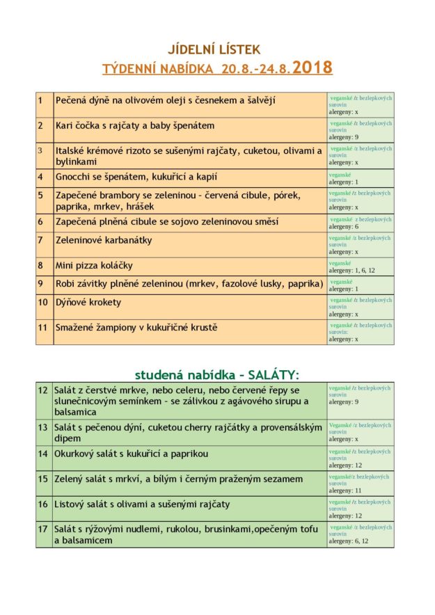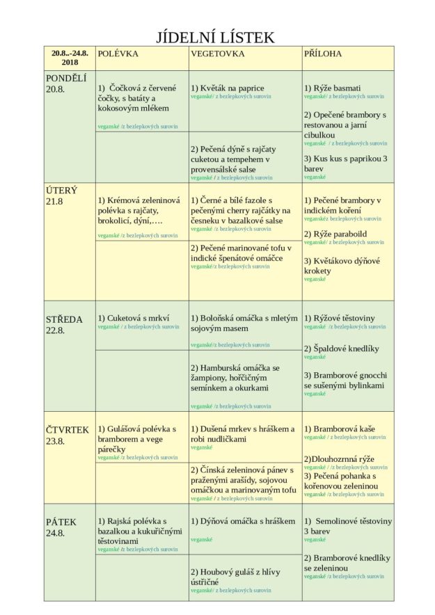 JÍDELNÍ LÍSTEK NA TÝDEN od 20. do 24.8.2018