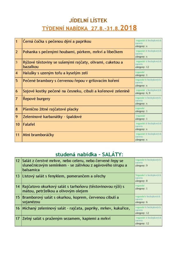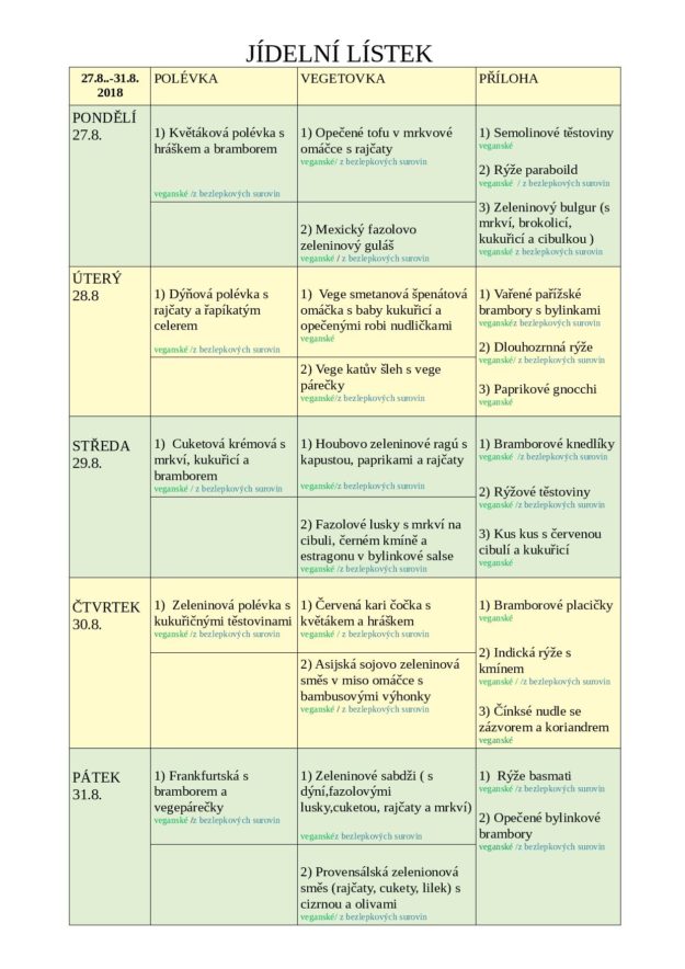 JÍDELNÍ LÍSTEK NA TÝDEN od 27. do 31.8.2018