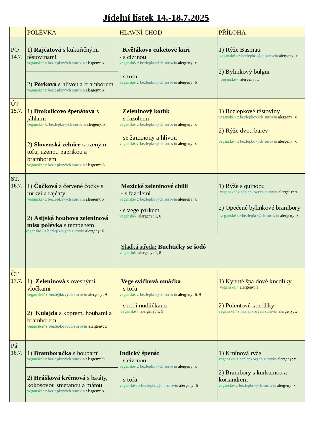 JÍDELNÍ LÍSTEK 14.-18.7.2025