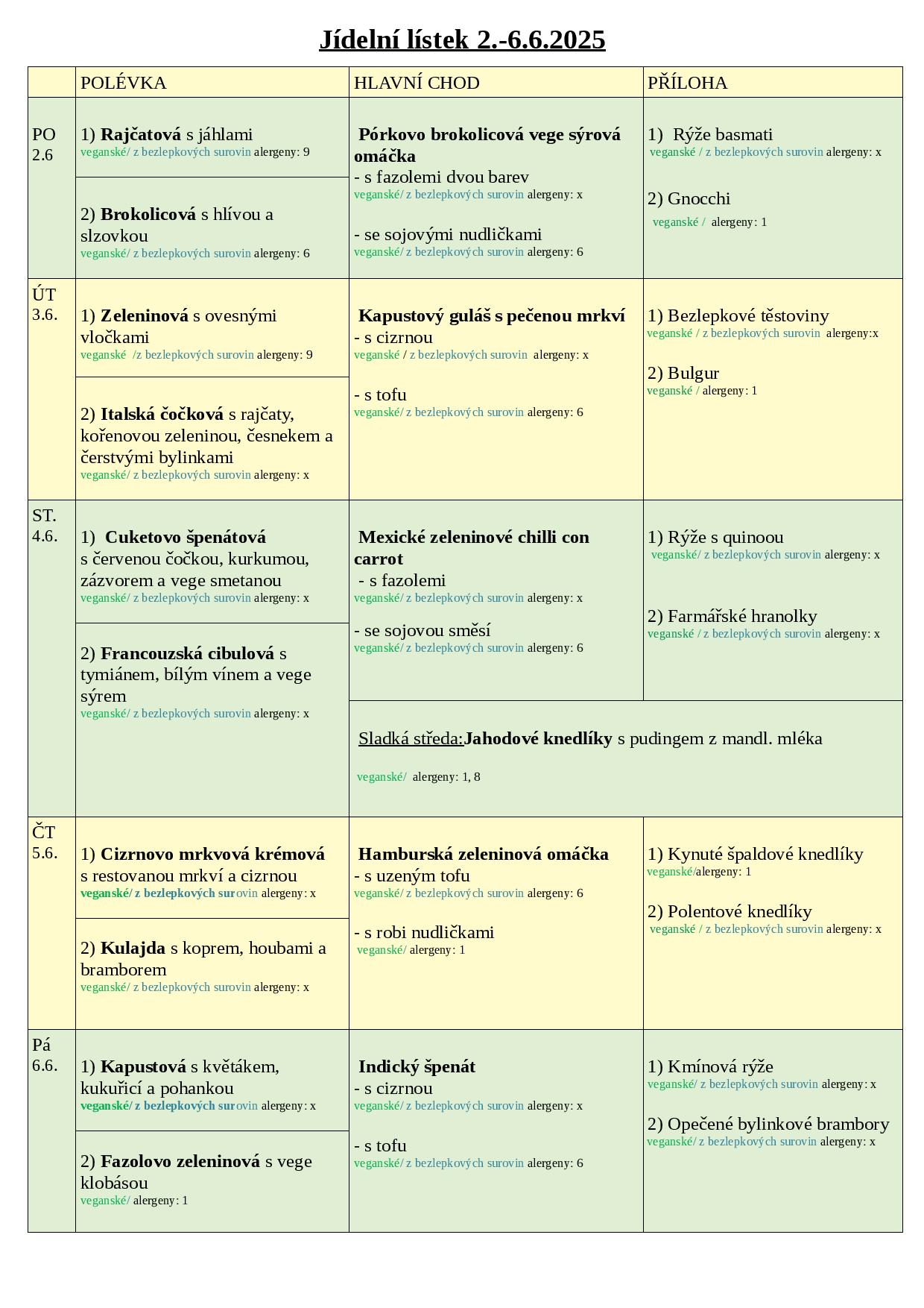 JÍDELNÍ LÍSTEK 2.-6.6. 2025