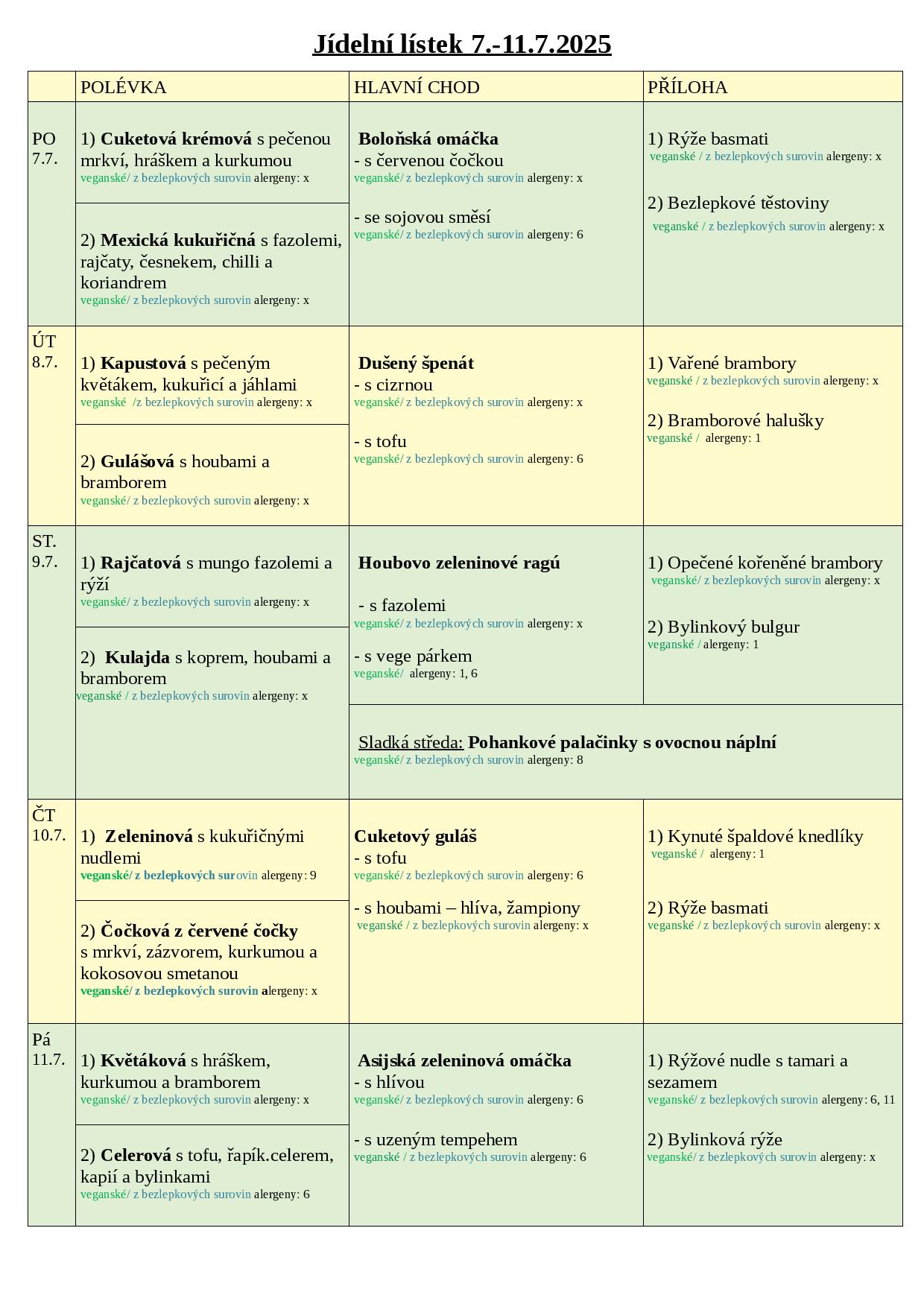 JÍDELNÍ LÍSTEK 7.-11.7. 2025